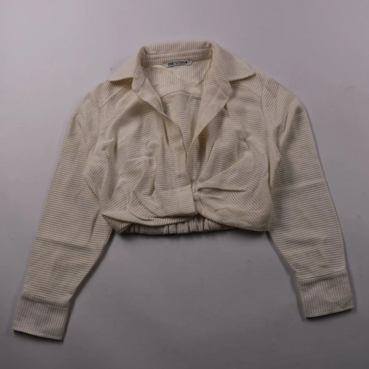 Укороченная лёгкая куртка Zara молочного оттенка из фактурного вафельного трикотажа, с отложным воротником и длинными рукавами. Подойдёт для тёплой весны/осени и многослойных образов поверх топов и платьев. Эластичный низ помогает посадке и делает вещь удобной в носке.