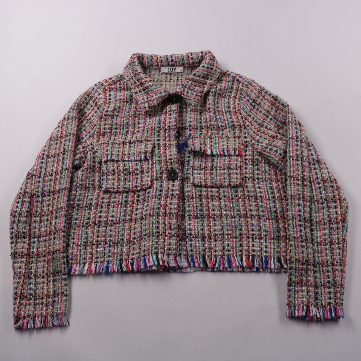 Короткая твидовая куртка JDY в расцветке мультиколор, с бахромой по низу и на манжетах, застёгивается на пуговицы и имеет накладные карманы на груди. Подойдёт для весны и прохладного лета, хорошо сочетается с джинсами и однотонными брюками. Плотная ткань держит форму и выглядит фактурно.