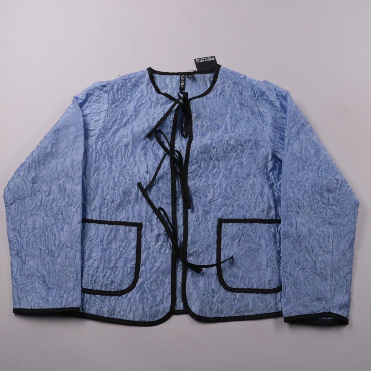 Лёгкая женская ветровка Pieces в светло-голубом оттенке с фактурной тканью и отделкой чёрным кантом. Застёгивается на завязки, есть накладные карманы — подойдёт для прохладных дней и слоистых образов. Материал практичный: не мнётся и быстро сохнет.