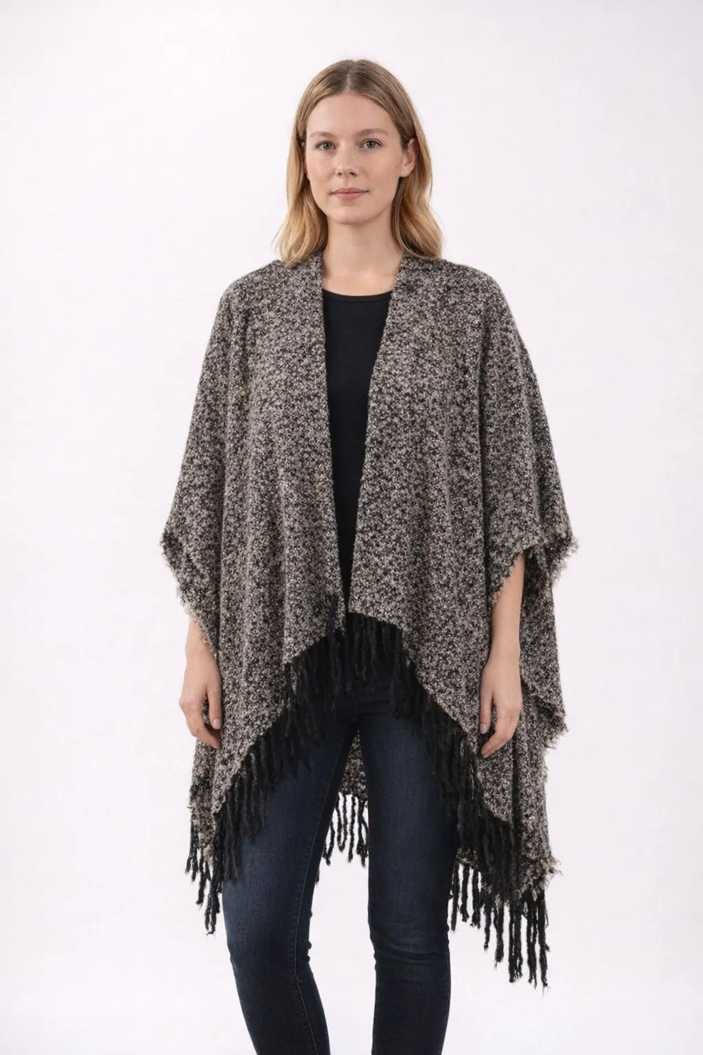 Накидка‑пончо LaTosca в серо‑чёрном меланже с длинной бахромой по краю. Подойдёт для прохладной погоды в межсезонье и как верхний слой поверх водолазки или лонгслива. Свободный крой не сковывает движения и легко комбинируется с базовыми вещами.