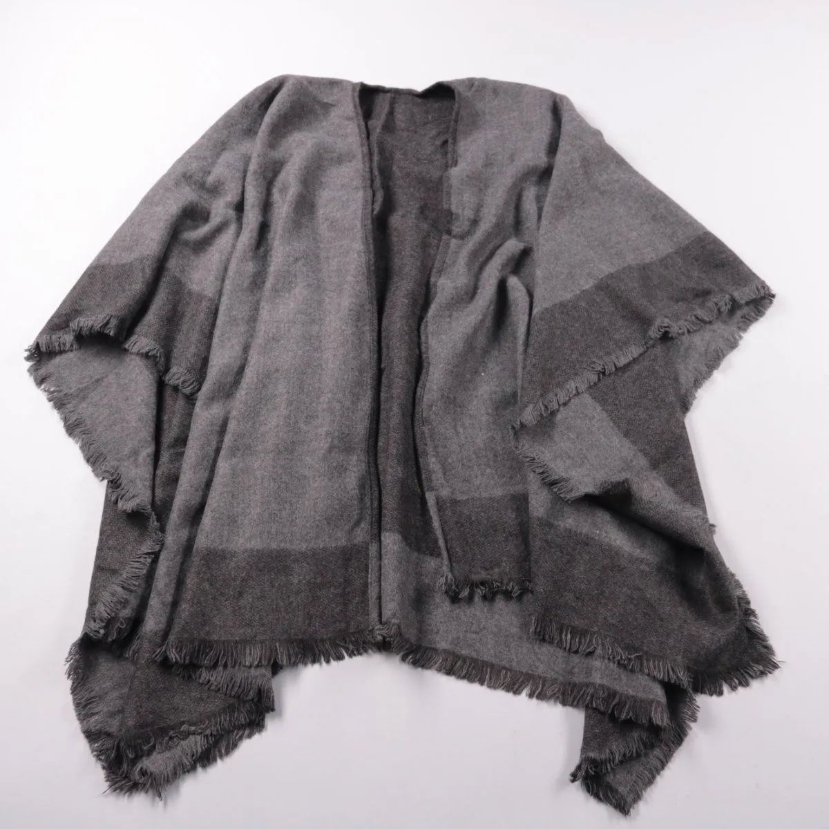 Широкий серый шарф-палантин с бахромой и контрастной каймой. Удобно носить как шарф или накидывать на плечи в прохладную погоду. Практичный нейтральный цвет легко сочетается с базовым гардеробом.