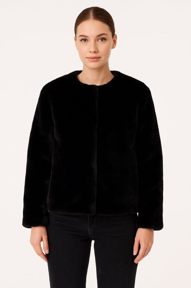 Женская короткая шуба ONLY в чёрном цвете, мягкая на ощупь и с лаконичным круглым вырезом. Подойдёт для повседневных образов в прохладную погоду и легко сочетается с джинсами и платьями. Практичное преимущество — лёгкая в уходе синтетическая основа и г...