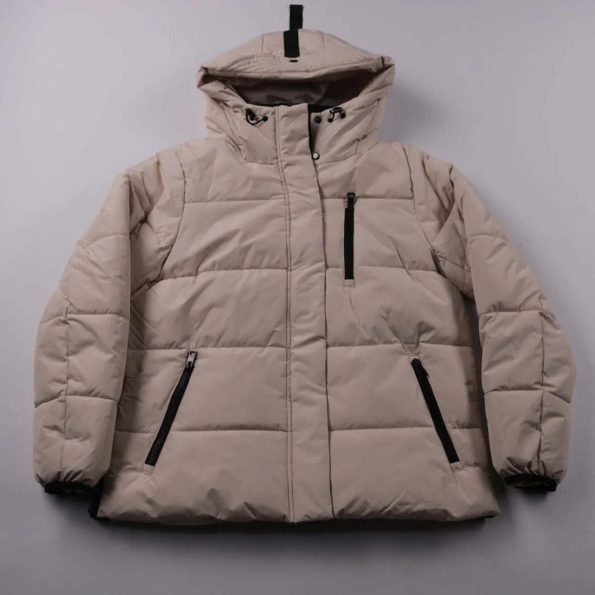Женский пуховик Esprit бежевого цвета с капюшоном и высоким воротом, застёжка на молнию. Подойдёт для зимних прогулок и повседневной носки в городе. Практичные карманы на молниях помогают удобно хранить телефон и мелочи.