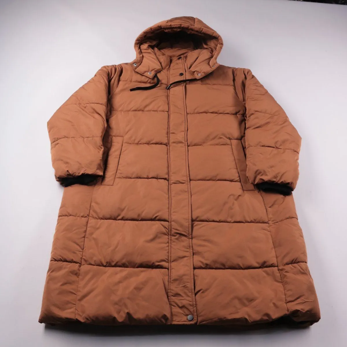 Женский стёганый пуховик George в цвете rust (коричневый) с капюшоном и застёжкой на молнию с планкой. Подойдёт для зимних прогулок и повседневной носки в холодную погоду. Практичный плюс — объёмный утеплитель и закрытая планка лучше защищают от ветра.