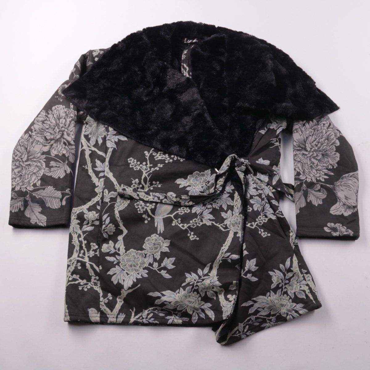 Зимняя куртка 101 IDEES с цветочным принтом и объёмным меховым воротником. Модель на запах с поясом, подойдёт для повседневной носки в холодную погоду. Пояс помогает регулировать посадку и подчёркивать талию.