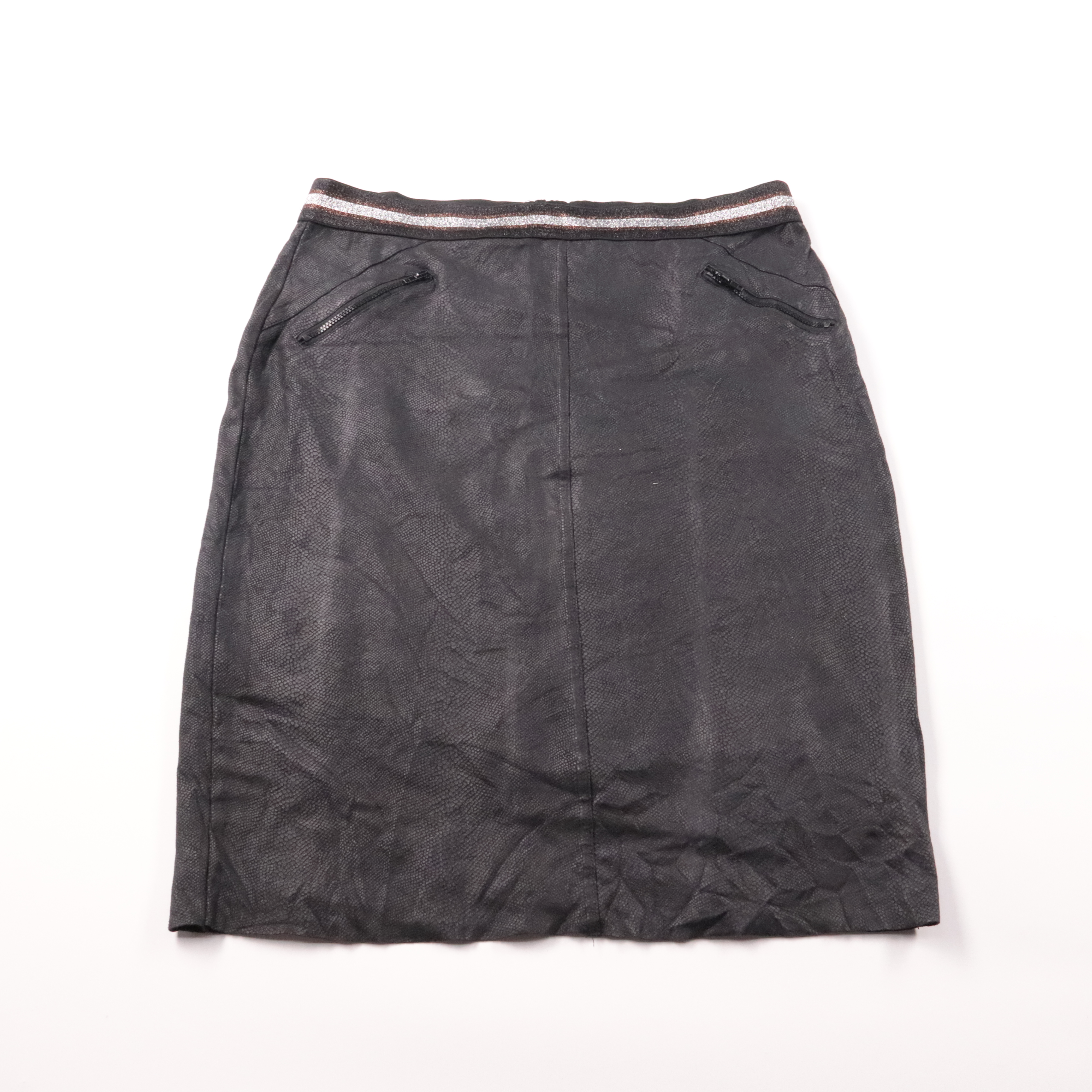Юбка Geisha чёрного цвета с фактурной поверхностью и поясом с люрексной полосой, есть карманы на молниях. Подойдёт для повседневных образов и офиса с рубашкой или свитером. Эластичная ткань хорошо садится по фигуре и не стесняет движения.