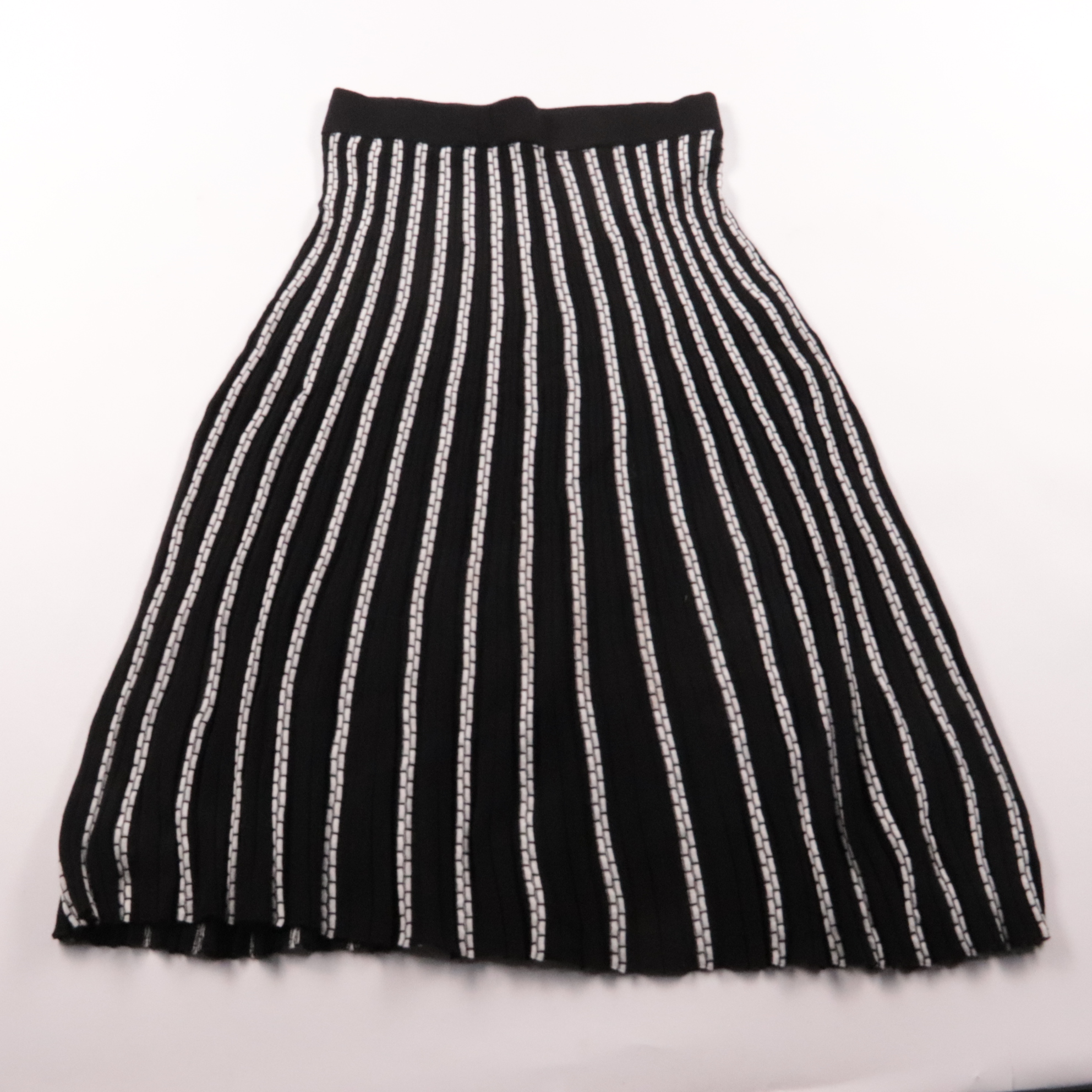Юбка F&F чёрного цвета с белыми вертикальными полосками и мягким эластичным поясом. Подойдёт для повседневных образов и в офис с базовым верхом и однотонной обувью. Плиссированная фактура хорошо держит форму и не требует сложного ухода.
