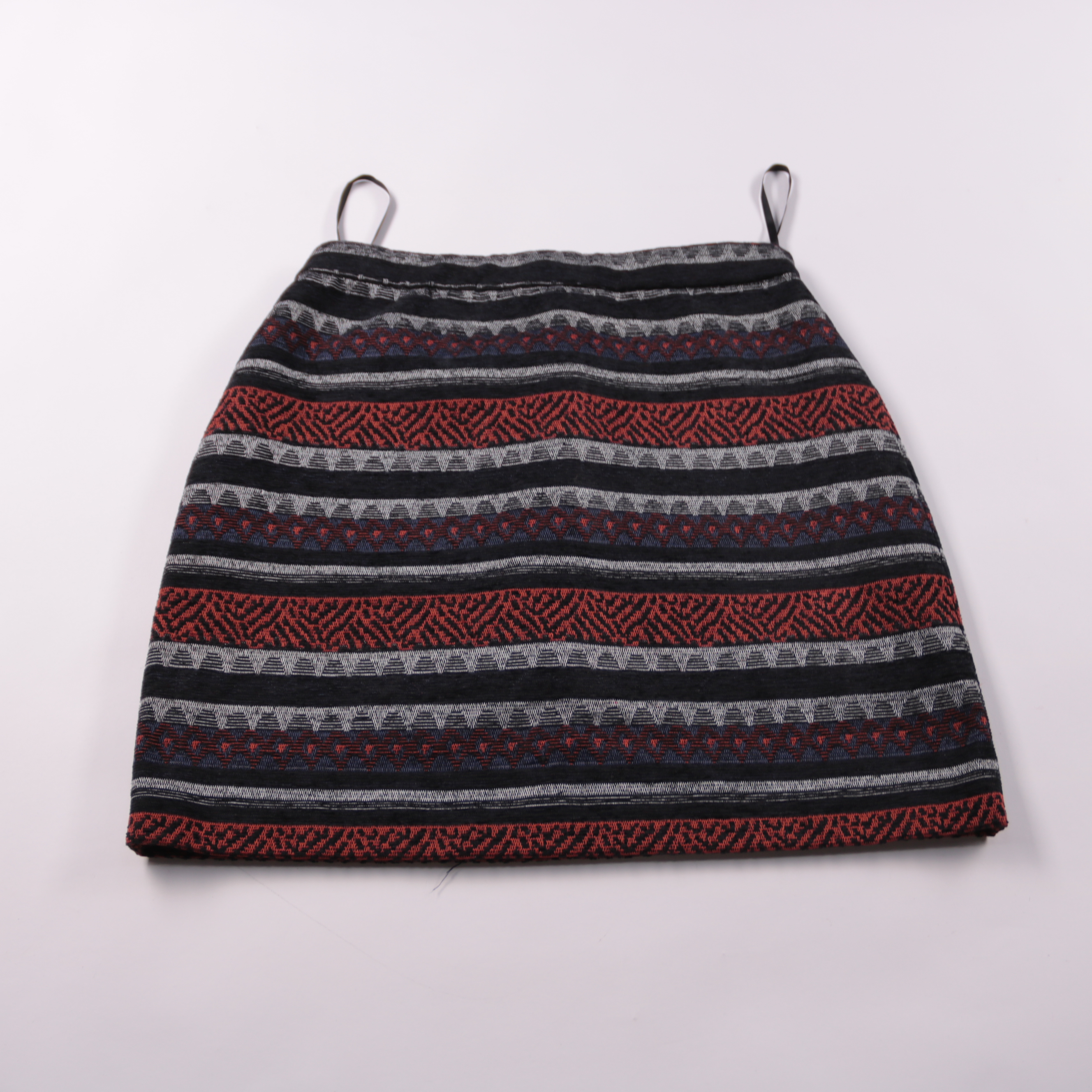 Юбка Dunnes с геометрическим жаккардовым узором в полоску в красно‑чёрно‑серых оттенках. Подойдёт для повседневных образов в прохладную погоду с водолазкой или свитером. Плотная ткань держит форму и выглядит аккуратно.