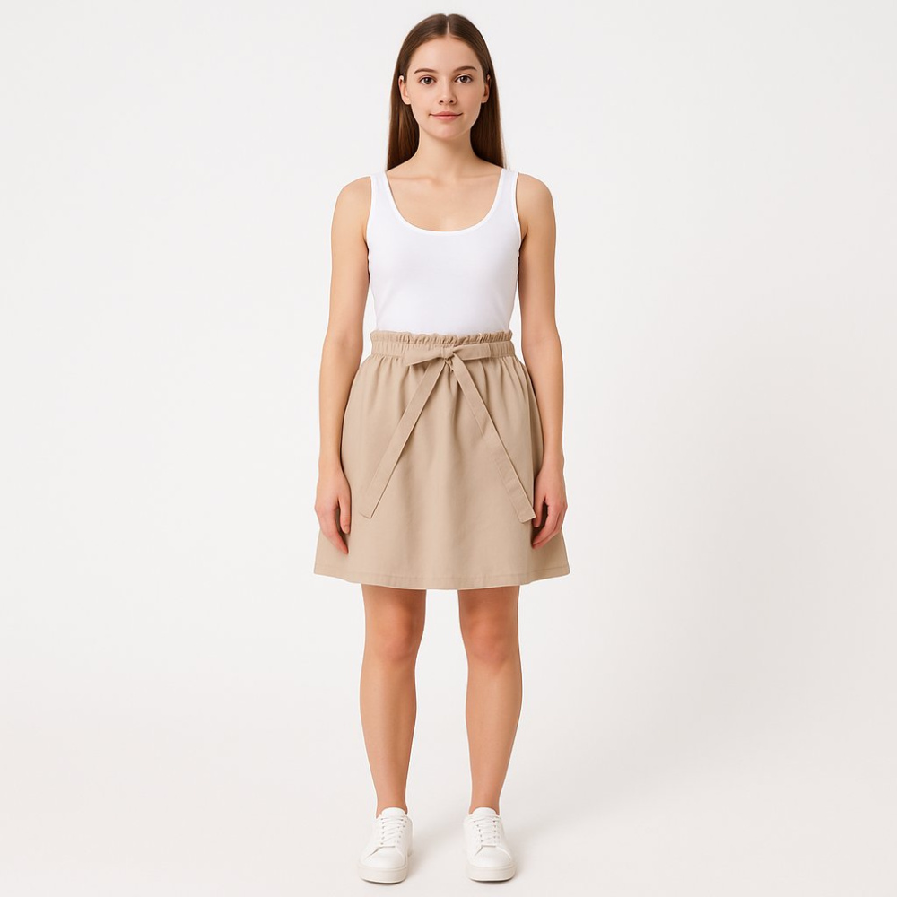 Юбка Reserved EcoAware бежевого цвета с высокой посадкой и эластичным поясом на завязках. Подойдёт для повседневных образов и офиса с базовыми топами и рубашками. Пояс на резинке удобно регулируется по талии.