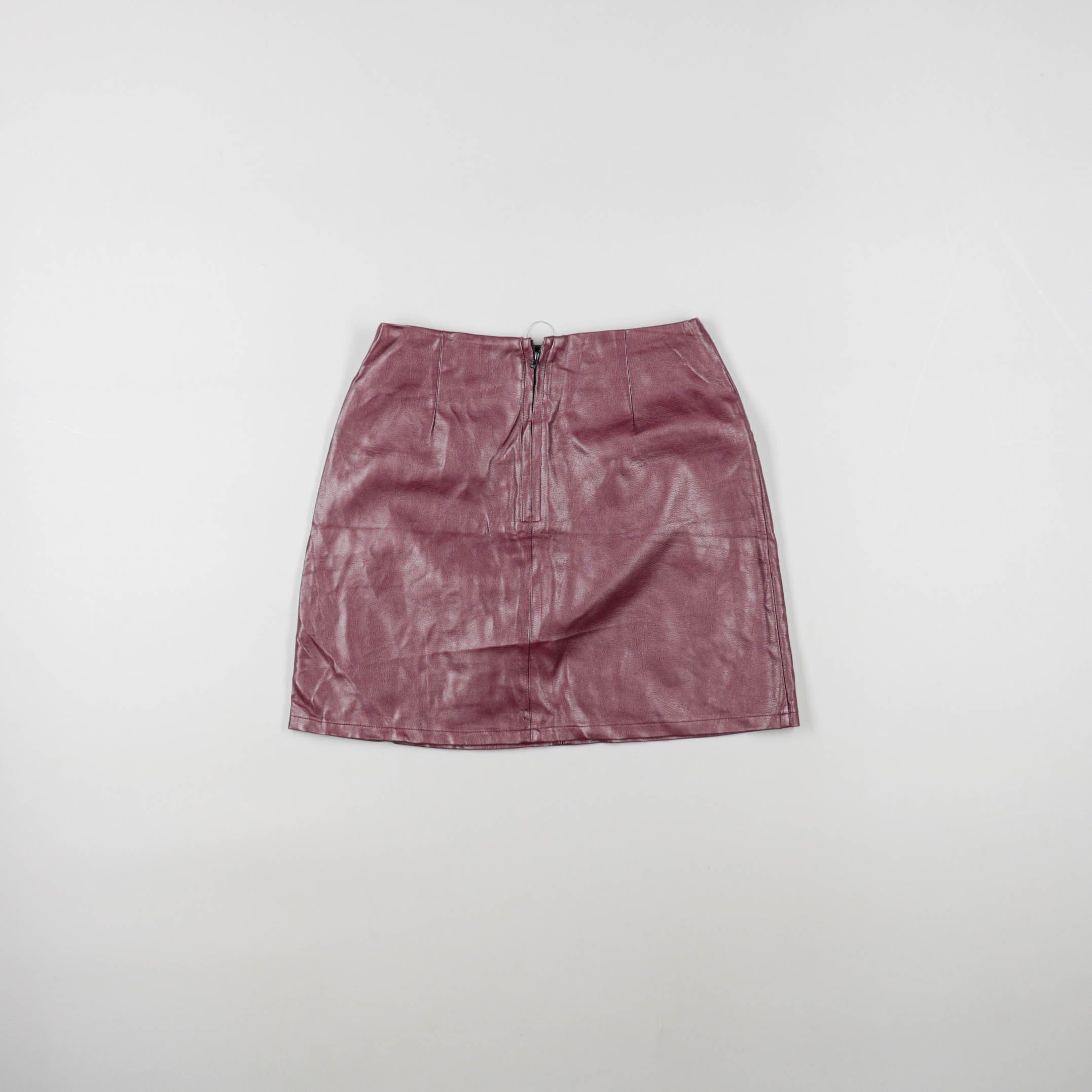 Женская мини-юбка из экокожи бордового оттенка, с молнией спереди и декоративными молниями сзади. Подойдёт для повседневных образов и вечерних выходов с ботильонами или кедами. Материал практичный — легко протирается и держит форму.