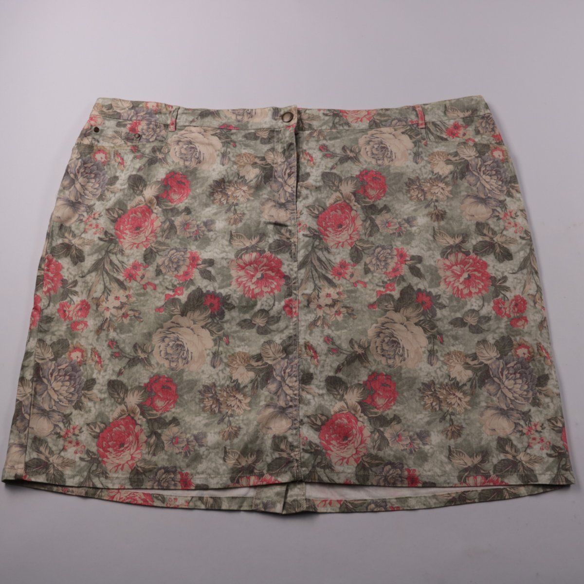 Юбка Thea Plus с цветочным принтом на серо-зелёном фоне и застёжкой на молнию/пуговицу. Подойдёт для повседневных летних образов и в офис с однотонным верхом. Ткань с хлопком и добавлением эластана немного тянется и комфортно садится по фигуре.