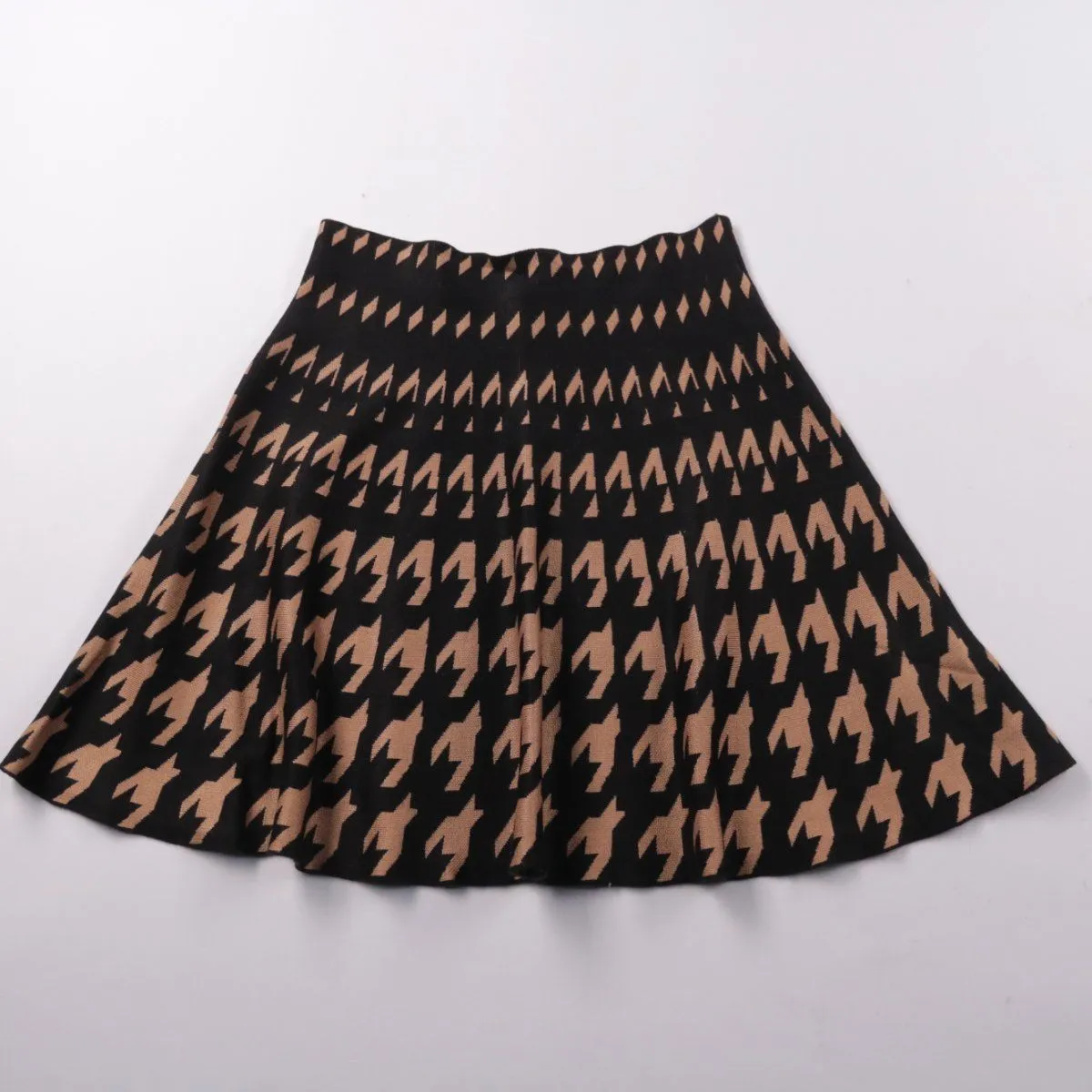 Юбка New Look А-силуэта с геометрическим жаккардовым узором в чёрно-бежевой гамме. Подойдёт для повседневных образов и офиса с однотонным верхом. Плотный трикотаж держит форму и меньше мнётся.