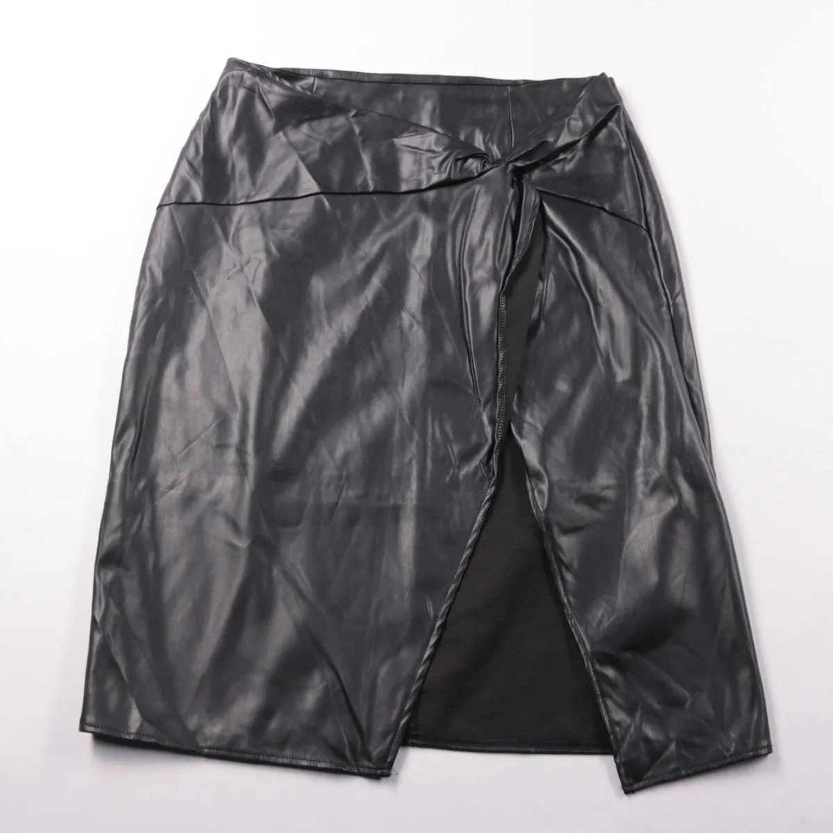Чёрная юбка из полиэстера с эффектом эко-кожи и запахом/узлом спереди. Подойдёт для повседневных образов и на выход, хорошо сочетается с базовыми топами и обувью на каблуке или кедами. Материал практичный: легко протирается и быстро сохнет.