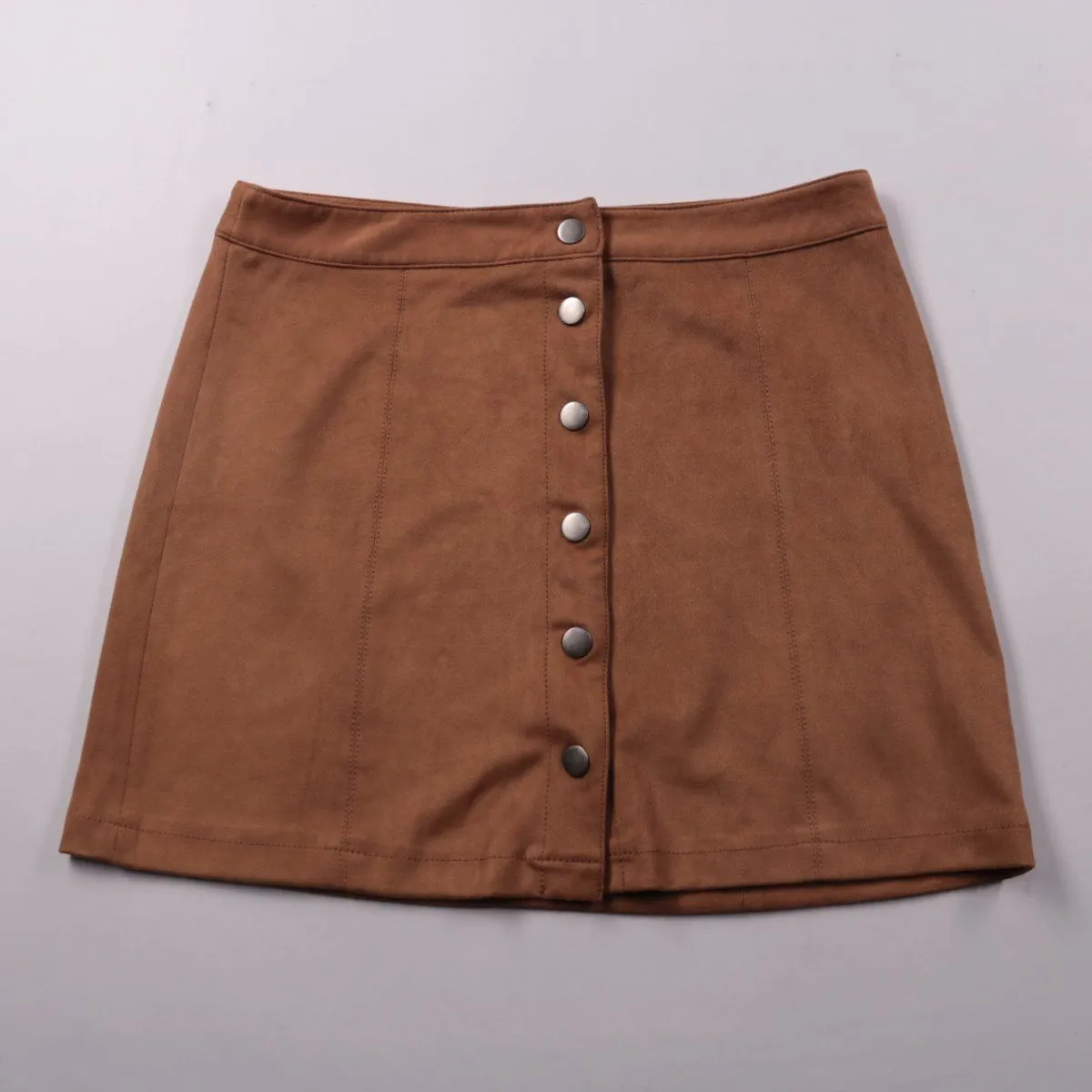 Юбка Dorothy Perkins из мягкого материала под замшу, коричневого цвета, с застёжкой на кнопках спереди. Подойдёт для повседневных образов в демисезон и прохладное лето, хорошо сочетается с футболками и свитерами. Тянущийся состав делает посадку более комфортной.