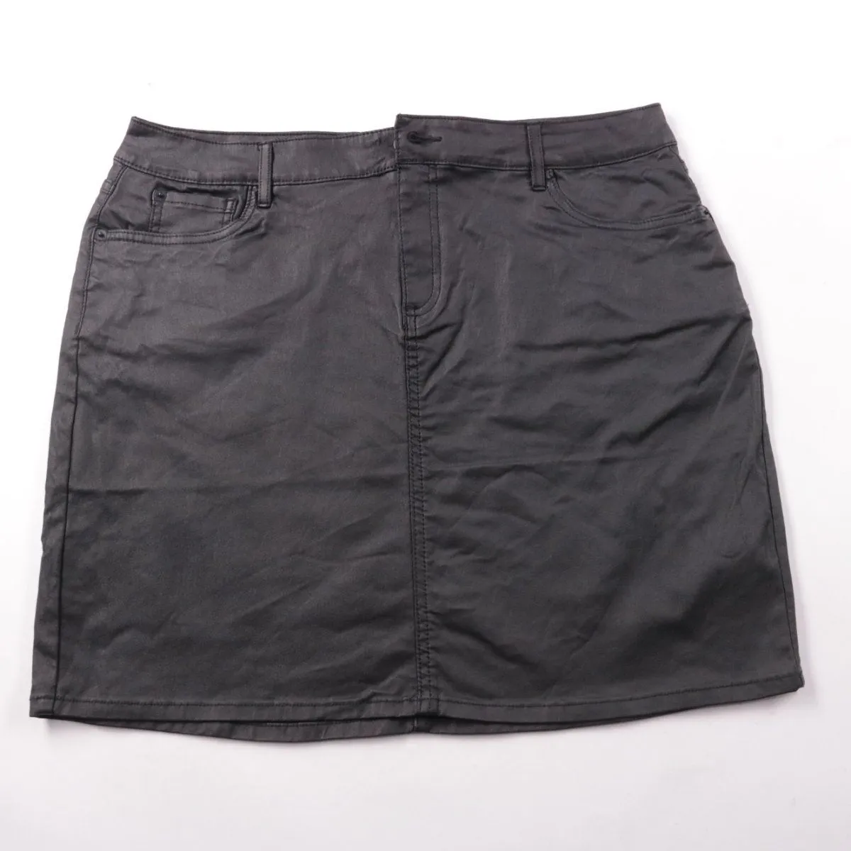 Женская юбка F&F из чёрного материала с эффектом кожи, прямого кроя, с молнией и шлёвками под ремень. Подойдёт для повседневных образов и офиса с рубашкой или свитером. Практична в уходе и хорошо сочетается с базовой обувью.